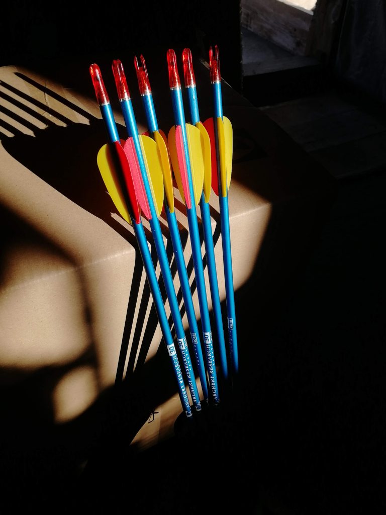 The bow pulls about 21kg or 46lbs at 30” (which is my draw lenght) and I’ve bought 6 fairly cheap 30” aluminum arrows to try out, and I also have a mismatched wooden one that I got with the bow parts: